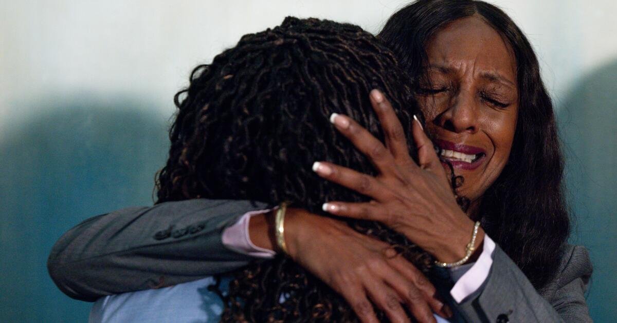 Ο ακτιβιστής Naji Ali αγκαλιάζει τη Franciola Armstrong, τη μητέρα του Keith Porter Jr., αφού μίλησε με μέσα ενημέρωσης στο Studio City τη Δευτέρα.