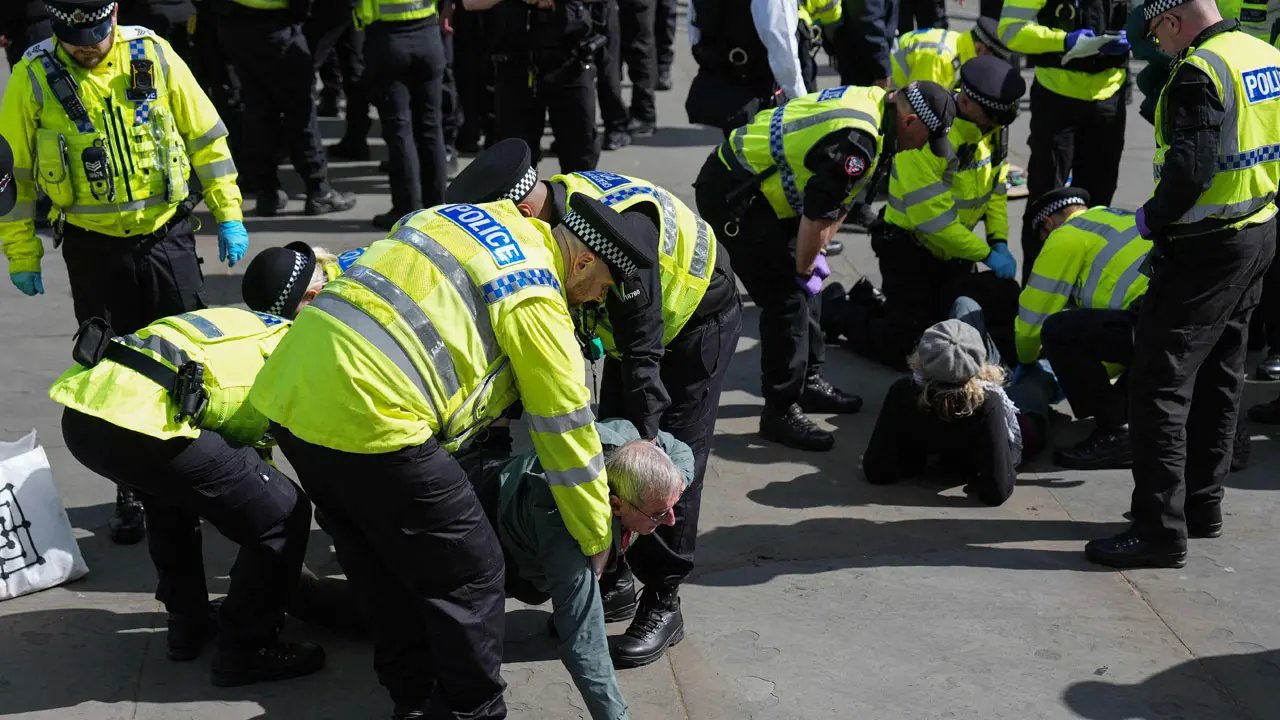 Η αστυνομία απομάκρυνε τους ακτιβιστές καθώς άλλοι διαδηλωτές που συγκεντρώθηκαν για μια καθιστική διαμαρτυρία στην πλατεία Τραφάλγκαρ της πρωτεύουσας ζητωκραύγαζαν και χειροκροτούσαν.