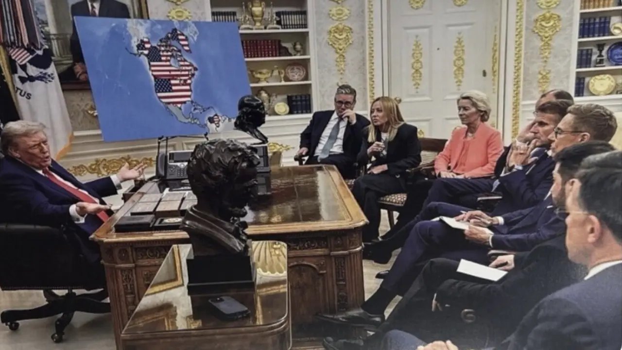 Σε μια από τις αναρτήσεις, ο Τραμπ μοιράστηκε μια παλιά φωτογραφία του να κάθεται στο Οβάλ Γραφείο με αρκετούς Ευρωπαίους ηγέτες, όπως ο Γάλλος Πρόεδρος Εμανουέλ Μακρόν, ο Ιταλός πρωθυπουργός Τζόρτζιο Μελόνι, ο Βρετανός πρωθυπουργός Κιρ Στάρμερ και η πρόεδρος της Ευρωπαϊκής Επιτροπής Ούρσουλα φον ντερ Λάιεν. Η εικόνα παρουσιάζει έναν χάρτη σημαίας των ΗΠΑ που απεικονίζει τον Καναδά, τη Γροιλανδία και τη Βενεζουέλα ως εδάφη των ΗΠΑ.