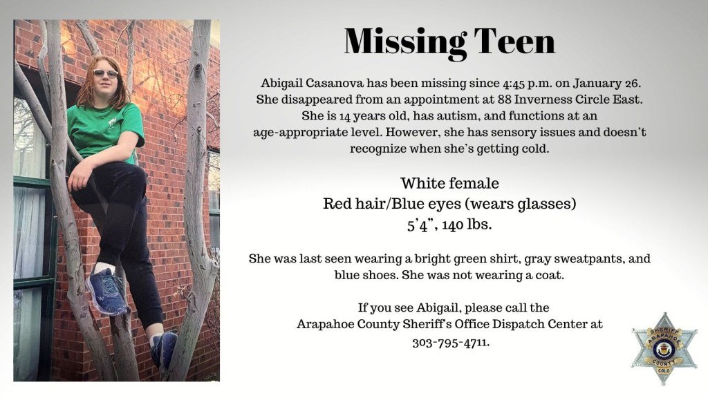 Οι αναπληρωτές του σερίφη της πόλης Arapahoe ανέπτυξαν σκύλους και drones το βράδυ της Δευτέρας αναζητώντας ένα 14χρονο κορίτσι που χάθηκε γύρω στις 4:45 μ.μ., σύμφωνα με ανακοίνωση του πρακτορείου που δημοσιεύτηκε στα μέσα κοινωνικής δικτύωσης. Η Abigail Casanova εθεάθη για τελευταία φορά στο 88 East Inverness Circle. Οποιοσδήποτε έχει πληροφορίες παρακαλείται να καλέσει το … Περισσότερα