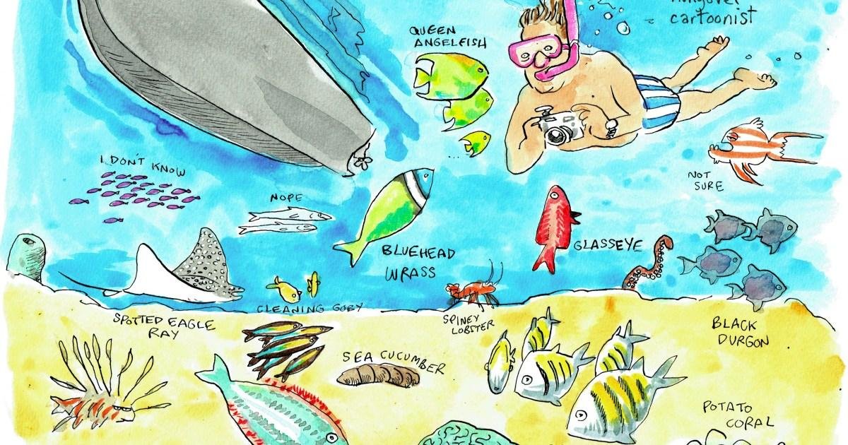 Πριν από λίγες μέρες μείναμε στο Coco Reef Resort στη δυτική πλευρά του Store Bay, ένα ξενοδοχείο με μια τεράστια ρεσεψιόν και τραπεζαρία σε στυλ λόμπι που αρνείται να ξεκαθαρίσει πού συναντώνται το εσωτερικό και το εξωτερικό. Αφού με εντόπισε ένα επιτελείο σκιτσογράφων, μεταφέρθηκα σε ένα πορτρέτο του Gerald Scarfe που τραβήχτηκε στα τέλη της δεκαετίας του 1990 ενώ περπατούσα εκεί.